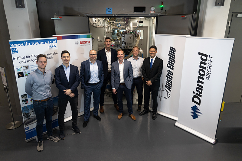 Representatives of the Vienna University of Technology, Austro Engine and Bosch General Aviation Technology in front of the test bench of the university